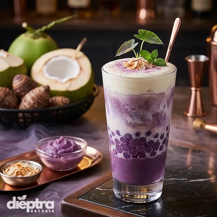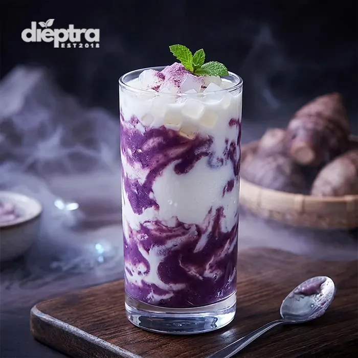 Trà sữa khoai môn cốt dừa: Tăng độ béo ngậy và màu sắc sang trọng.