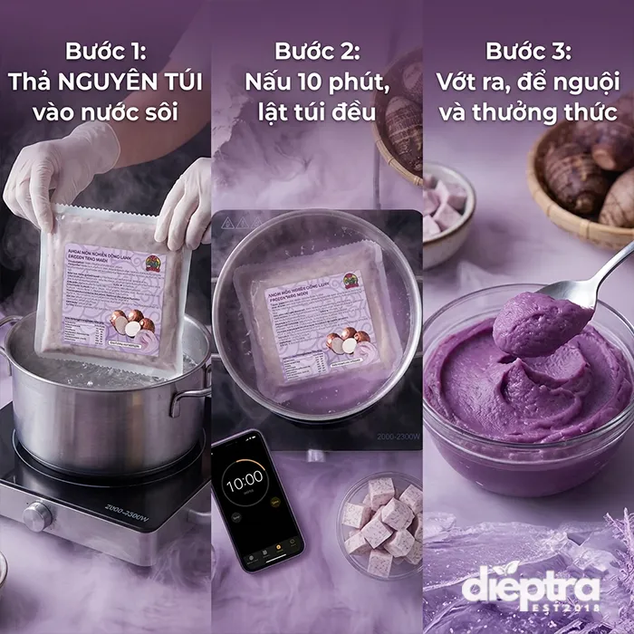 Nếu tự chế biến khoai môn từ củ tươi, bạn sẽ mất ít nhất 45-60 phút cho các công đoạn gọt vỏ, hấp, nghiền. Với khoai môn tím đông lạnh Lermao, mọi thứ đã sẵn sàng: