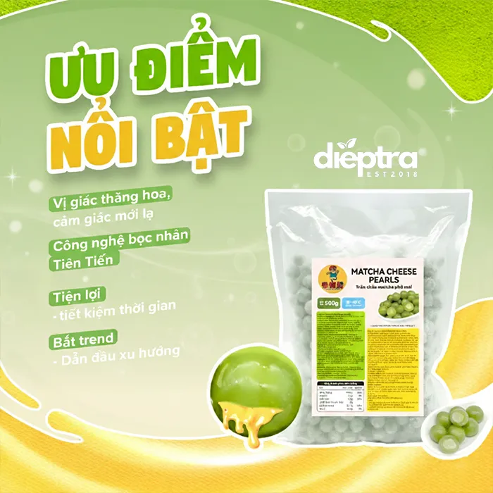 Bạn đang tìm kiếm một loại topping độc đáo để làm mới menu đồ uống? Trân Châu Matcha Phô Mai chính là câu trả lời hoàn hảo. Không chỉ sở hữu màu xanh bắt mắt, sản phẩm này còn gây ấn tượng bởi sự hòa quyện giữa vị trà thanh mát và nhân phô mai béo ngậy, tan chảy.